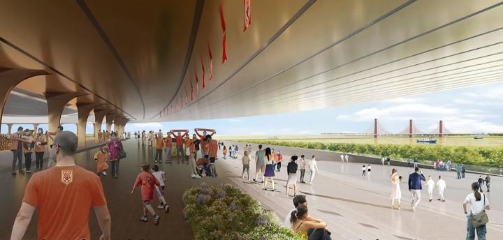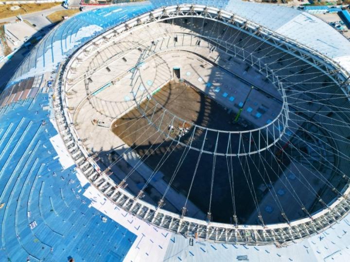 轮辐式索桁架体系的吊装采用“低空无应力组装→空中牵引提升→高空分级同步张拉”的工艺流程,依托索提升张拉集群化液压控制系统,并设立集中控制室,确保48个轴线拉索同步提升张拉。根据施工计划,项目后续将推进室内装饰装修、金属屋面、场芯膜及桁架模施工。项目全面建成后,将推动济南起步区“体育+”产业集聚发展,助力打造济南足球城市新名片。
