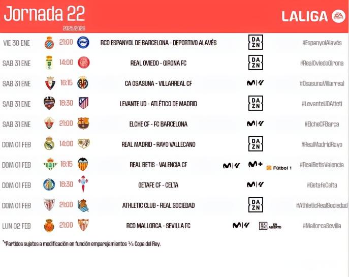 西甲官方公布了第22轮比赛开球时间,巴萨客战埃尔切将于北京时间2月1日凌晨4:00进行,皇马主场战巴列卡诺将在2月1日21:00进行。