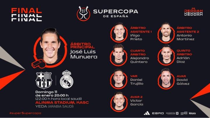 近日,西班牙足协公布了西班牙超级杯决赛裁判组名单,比赛将于北京时间1月12日3:00进行。