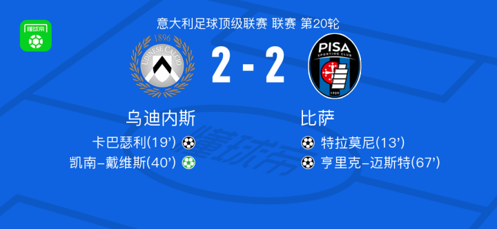 乌迪内斯2-2比萨,特拉莫尼先拔头筹,亨里克-迈斯特扳平比分