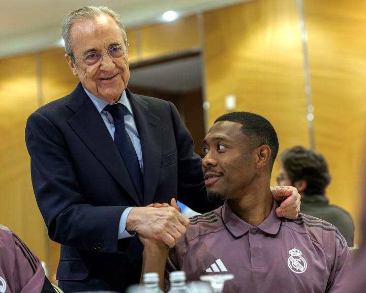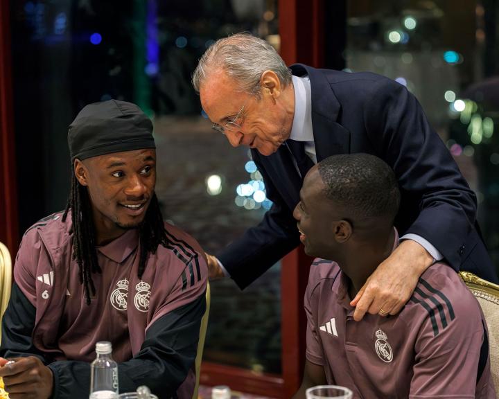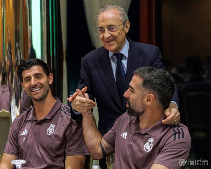 皇马官方晒照,俱乐部主席弗洛伦蒂诺已抵达吉达,在球队下榻酒店与球员和教练组打招呼。