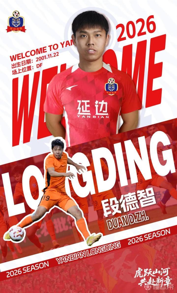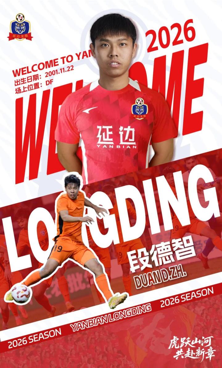 北京时间1月11日,官方消息,经与球员本人友好协商并达成一致, 球员段德智(租借)、 孙锡鹏正式加盟延边龙鼎足球俱乐部。