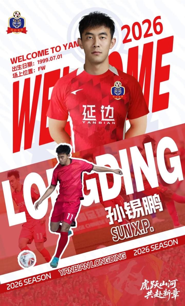 欢迎孙锡鹏加盟延边龙鼎足球俱乐部,期待他在前场的亮眼表现,美丽延边欢迎你!