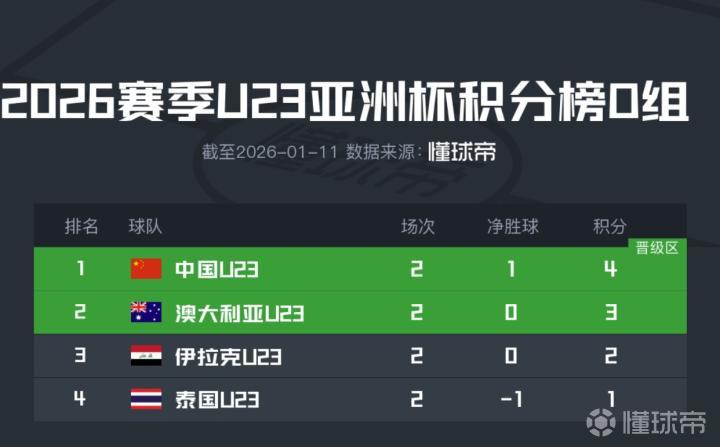 中国U23在本轮战胜澳大利亚U23后上升到了小组第一的位置,澳大利亚U23则在输球后下滑到了小组第二,伊拉克U23遭遇两连平排名小组第三,泰国U23则积1分排名末位。但是4支队伍没有一支提前出局,也没有提前晋级的。