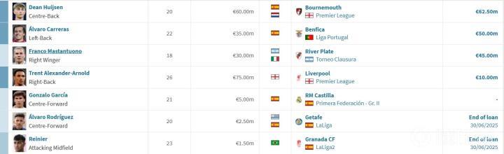 今年夏窗阿隆索上任后,皇马签下了赫伊森、卡雷拉斯、马斯坦托诺、阿诺德等球员。夏窗皇马的引援投入高达1.675亿欧元。