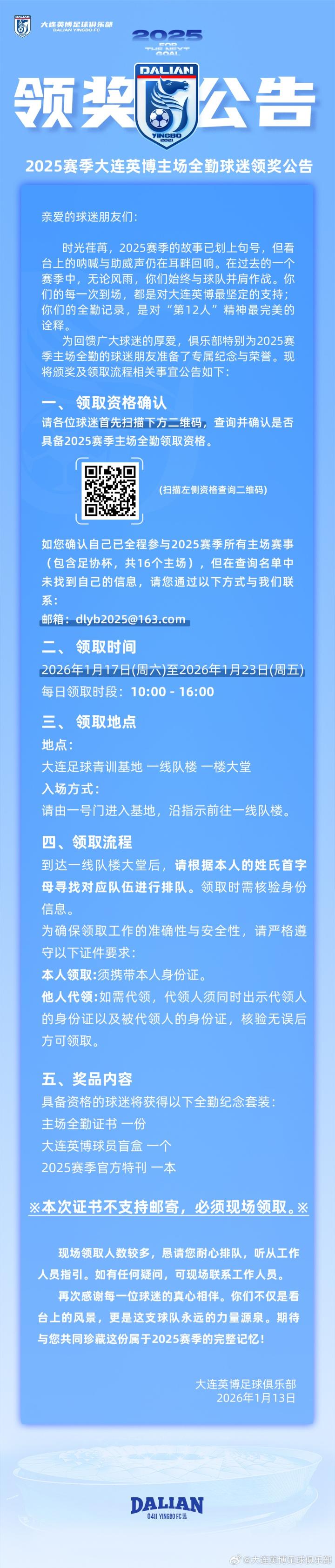 2025赛季大连英博主场全勤共16场主场比赛,包括中超主场外加足协杯主场,俱乐部安排球迷在1月17日至1月23日在大连足球青训基地一线队楼一楼大堂领取全勤纪念套装。
