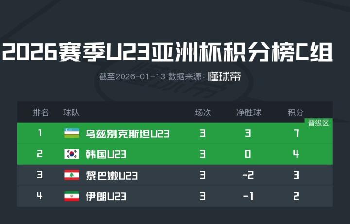 北京时间1月13日,U23亚洲杯C组第3轮的比赛结束,乌兹别克斯坦U23获得小组头名出线,韩国U23以第二名出线。