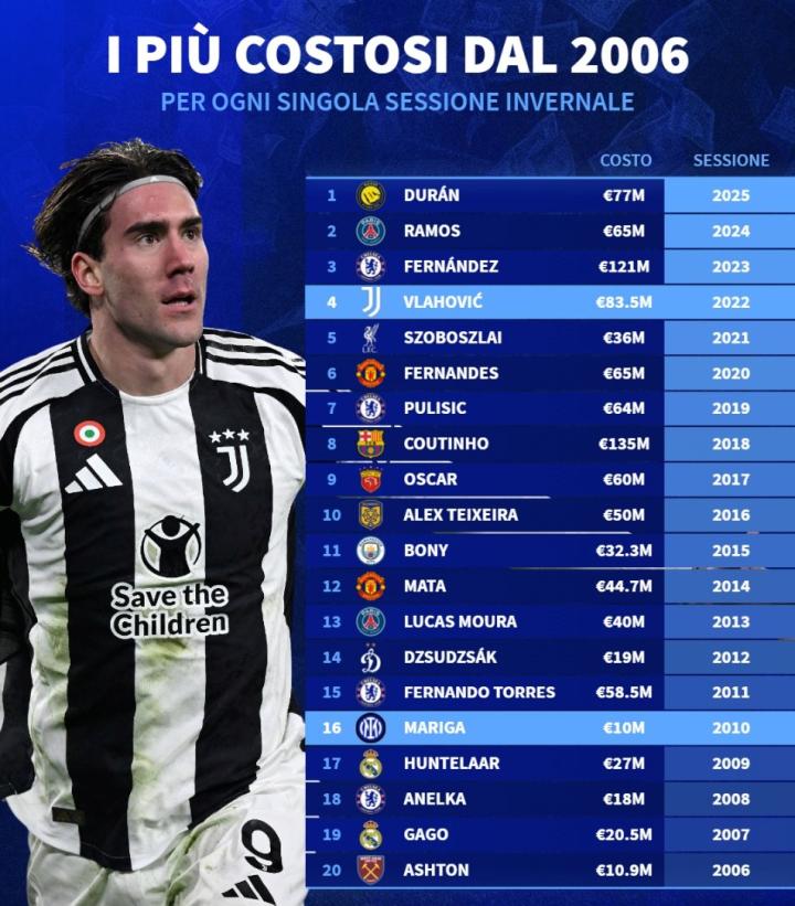 北京时间1月13日,德转列出了2006年至2025年全球俱乐部历年冬窗引援的标王,巴塞罗那2018年1月从利物浦1.35亿欧元引进库蒂尼奥排名第一,2016年和2017年冬窗的全球标王均由中超俱乐部制造。