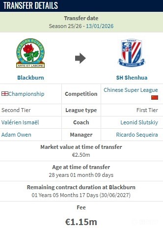 德转显示,布莱克本前锋盖伊加盟上海申花的转会费为115万欧。
