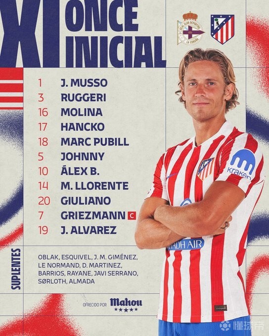 马竞首发:1-穆索、3-鲁杰里、16-莫利纳、17-汉茨科、18-普维尔、5-卡多佐、10-巴埃纳、14- 马科斯-略伦特、20-朱利亚诺-西蒙尼、7-格列兹曼、19-阿尔瓦雷斯