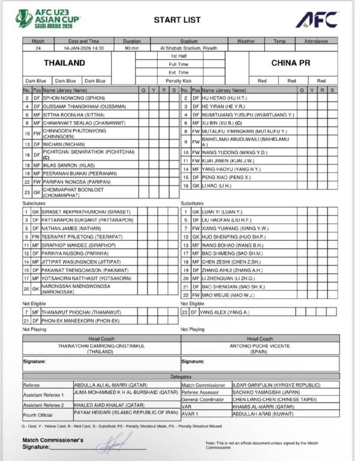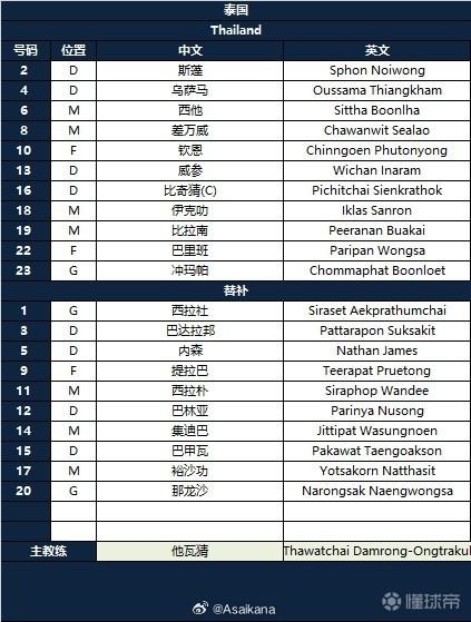 泰国U23首发:23-楚玛帕、2-沙蓬、4-乌萨马、13-威赞、16-比齐猜、6-西达、8-差万威、18-讪龙、19-比拉南、10-钦恩、22-巴里班