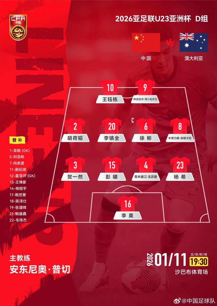 北京时间1月14日,中国U23将在U23亚洲杯小组赛末轮对战泰国U23,赛前,中国U23公布了本场比赛首发阵容。