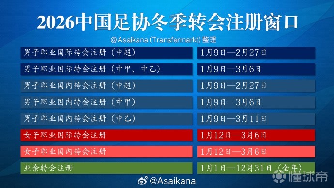 据德转管理员朱艺的消息,中国三级联赛的转会窗已从1月9日起开放,中超2月27日关窗,中甲则在3月6日,中乙在3月11日。