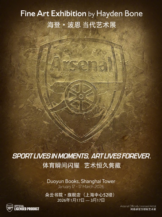 海登-波恩(Hayden Bone)工作室荣幸宣布,阿森纳官方授权艺术展,将于2026年1月17日登陆上海,开启世界首站,这是体育与艺术跨界融合的历史性时刻。
