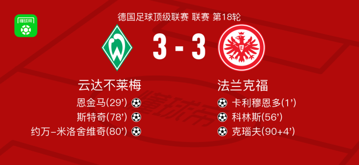 云达不莱梅3-3法兰克福,卡利穆恩多先拔头筹,克瑙夫救主