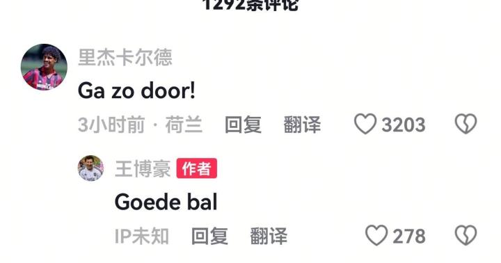 在王博豪的评论区里,荷兰传奇球星里杰卡尔德用荷兰语留言:“继续加油”。效力于荷兰乙级联赛邓伯什俱乐部的王博豪同样用荷兰语回复:“好球!”