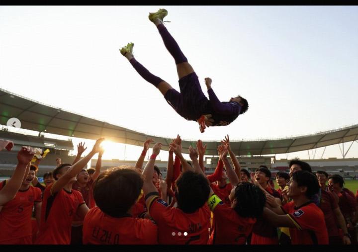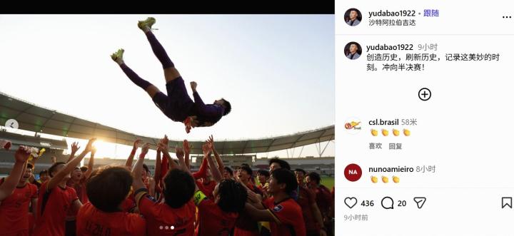 于大宝帖子的三张配图分别为赛后全队合影、点球大战结束后全队庆祝照、以及队友们将李昊高高抛起。