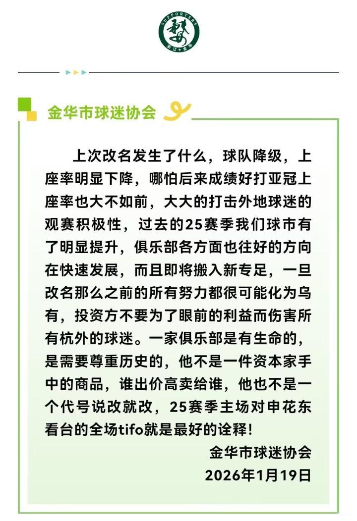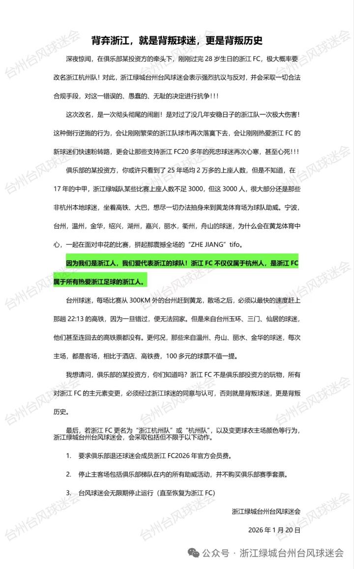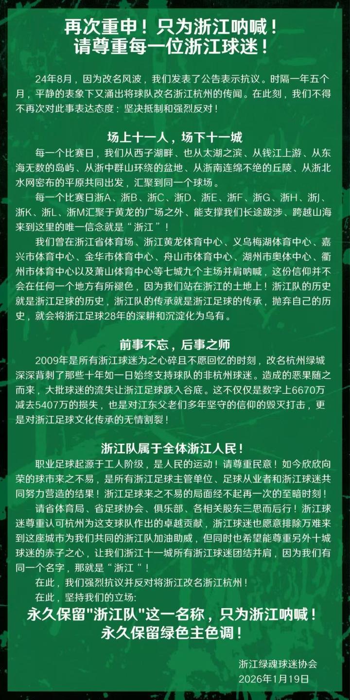 24年8月,因为改名风波,我们发表了公告表示抗议。时隔一年五个月,平静的表象下又涌出将球队改名浙江杭州的传闻。在此刻,我们不得不再次对此事表达态度:坚决抵制和强烈反对!