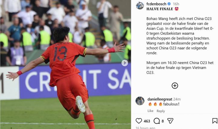 在U23亚洲杯中国战胜乌兹别克斯坦的比赛中,王博豪罚入了制胜点球,助中国U23挺进半决赛。当地时间1月19日,王博豪效力的荷乙邓伯什俱乐部发文祝贺。