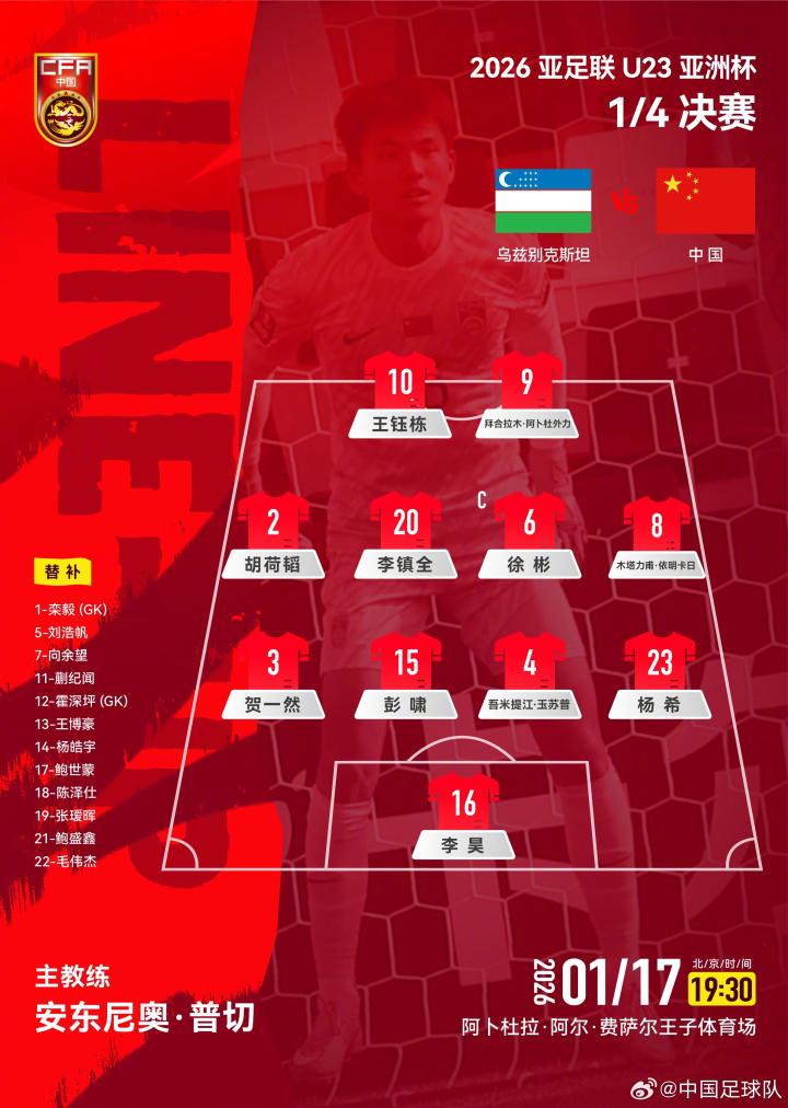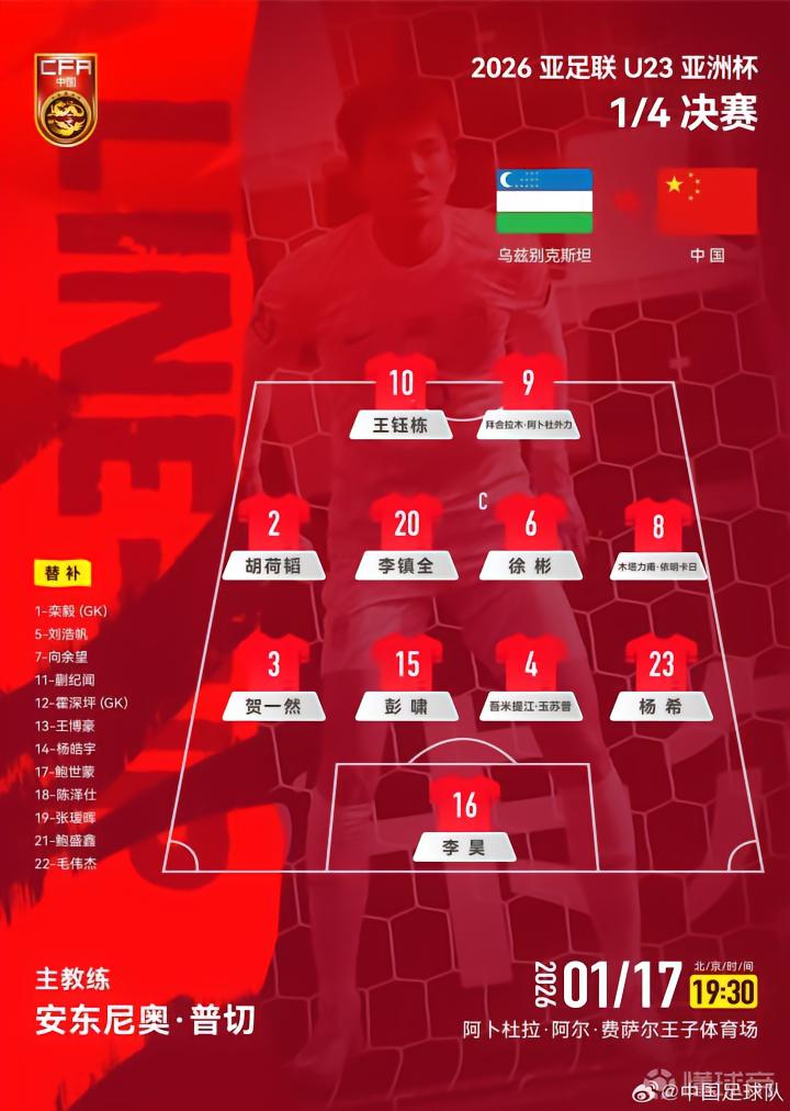 作为参考,下面是U23国足上一场比赛战胜乌兹别克斯坦的官方首发阵型图,共计进行了6处人员调整,其中后卫1处、中场3处、前锋2处。
