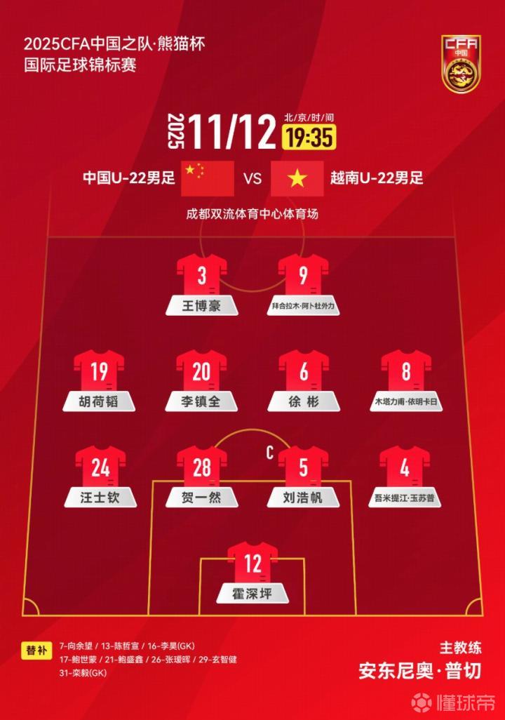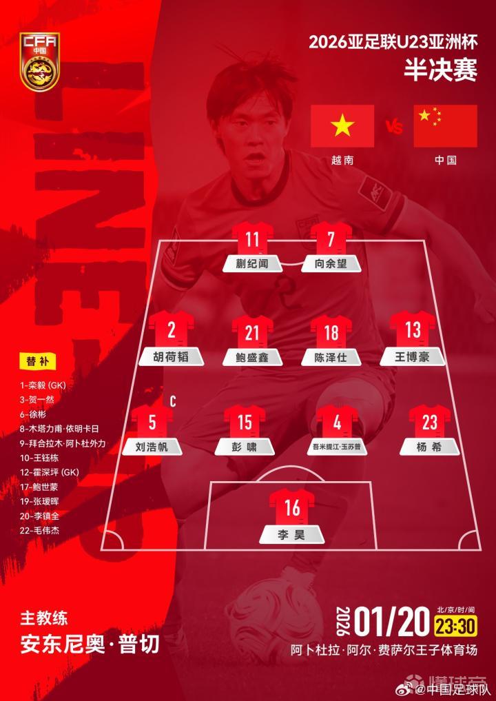 2026年U23亚洲杯半决赛,U23国足vs越南U23,双方首发已经产生。去年11月12日,双方在熊猫杯首轮交锋,当时中国队主场0-1告负。