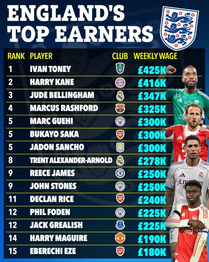 北京时间1月21日,英国《太阳报》统计出了英格兰球员周薪最高的15人,目前效力于吉达国民的伊万-托尼以42.5万英镑的周薪高居第一,哈里-凯恩41.6万英镑排名第二,贝林厄姆34.7万英镑第三,刚刚加盟曼城的格伊以30万英镑的周薪并列第五。