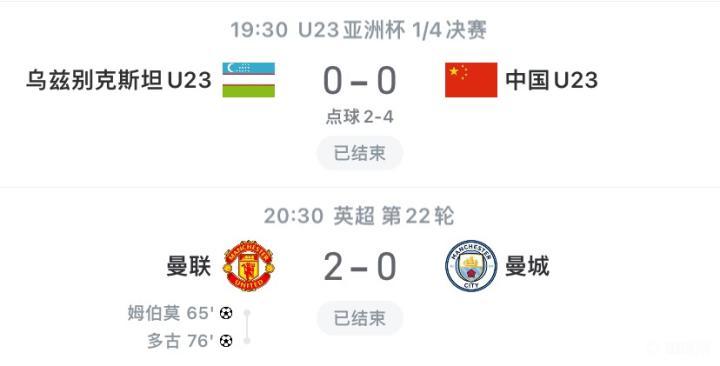 1月17日,中国U23在1/4决赛战胜乌兹别克斯坦U23,同时间段曼城在曼市德比中不敌曼联。