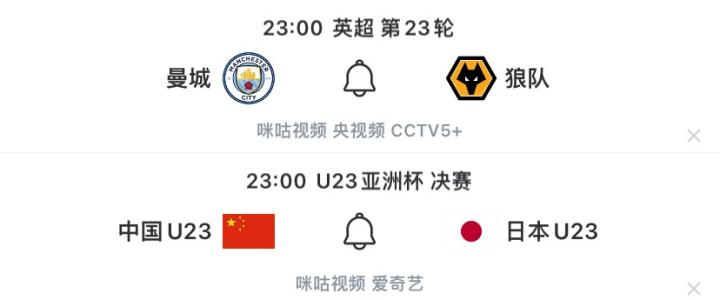 1月24日23:30,中国U23将在决赛中对阵日本U23,而曼城将对阵狼队。