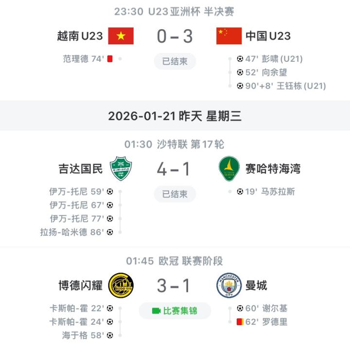 1月20日,中国U23在半决赛战胜越南U23,同时间段曼城在欧冠不敌博德闪耀。