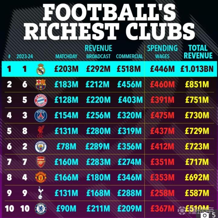 利物浦是英超唯一进入收入前五的球队,皇家马德里成为首支收入突破10亿英镑的俱乐部,紧随其后的是巴塞罗那、拜仁慕尼黑和巴黎圣日耳曼。