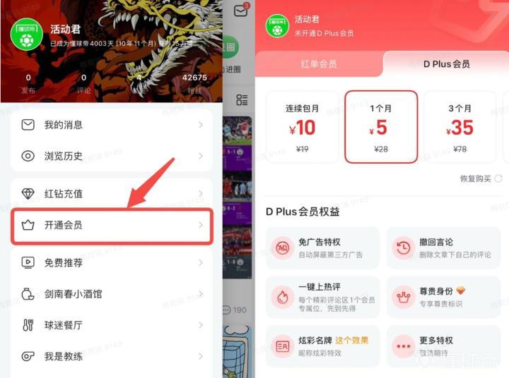 【参与路径】:打开懂球帝 APP → 点击侧边栏 → 点击「开通会员」→ 选择心仪D PLUS会员档位购买(1个月D PLUS会员限时5 元,任意档位均享进球加码)