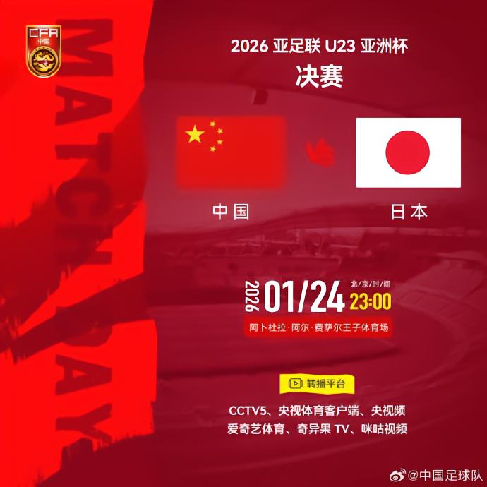 1月23日,中国足球队官方发布了U23亚洲杯决赛的转播计划。