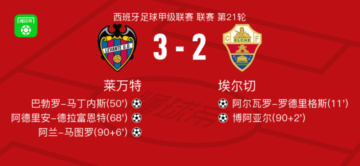 莱万特3-2逆转埃尔切,阿兰-马图罗、阿德里安-德拉富恩特破门