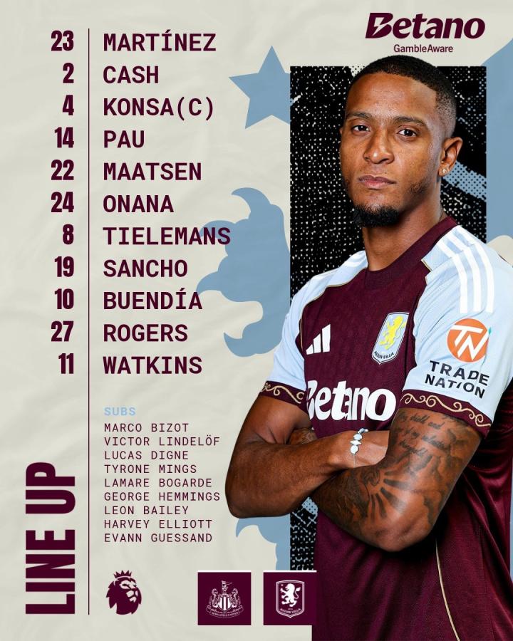 阿斯顿维拉首发:23-达米安-马丁内斯、2-卡什、4-孔萨、14-保-托雷斯、22-马特森、24-奥纳纳、8-蒂勒曼斯、19-桑乔、10-布恩迪亚、27-摩根-罗杰斯、11-沃特金斯