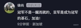 随后,在这条动态的评论区里,青岛西海岸足球俱乐部投资人徐尚留言鼓励:“冠军不是一蹴而就的,亚军是成为冠军的基石,加油!”