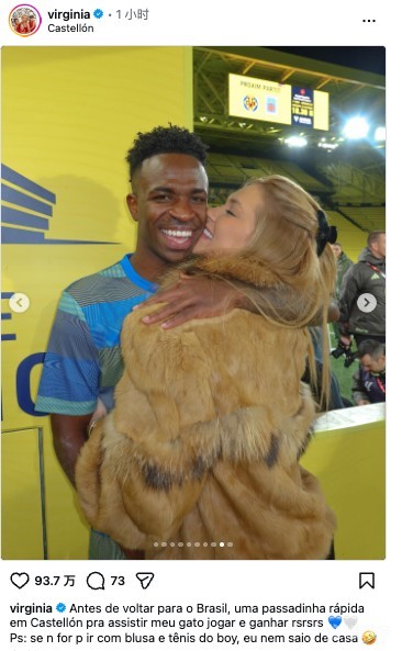 同时也晒出了和维尼修斯在赛后的合影,维尼修斯女友维吉尼亚是巴西国内颇有影响力的网红,在社交媒体上拥有超过5000万粉丝。