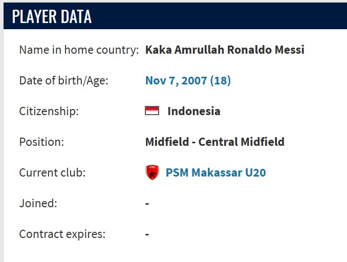 这名18岁的印尼球员名叫卡卡-阿姆鲁拉-罗纳尔多-梅西(Kaka Amrullah Ronaldo Messi),他的名字中同时包含了世界足坛三位巨星的名字。更有意思的是,他的全名顺序,恰好对应了2007年金球奖的排名——而那一年,正是他出生的年份。
