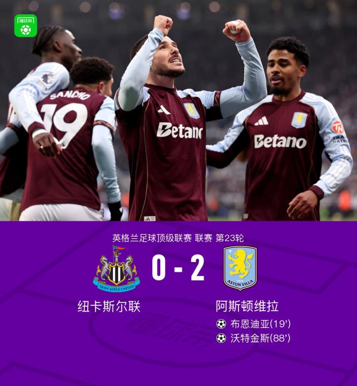 维拉2-0客胜纽卡,布恩迪亚远射破门,沃特金斯头球建功