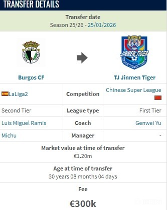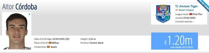 北京时间1月26日,德转更新,西乙布尔戈斯队长科尔多瓦加盟天津津门虎,转会费30万欧。