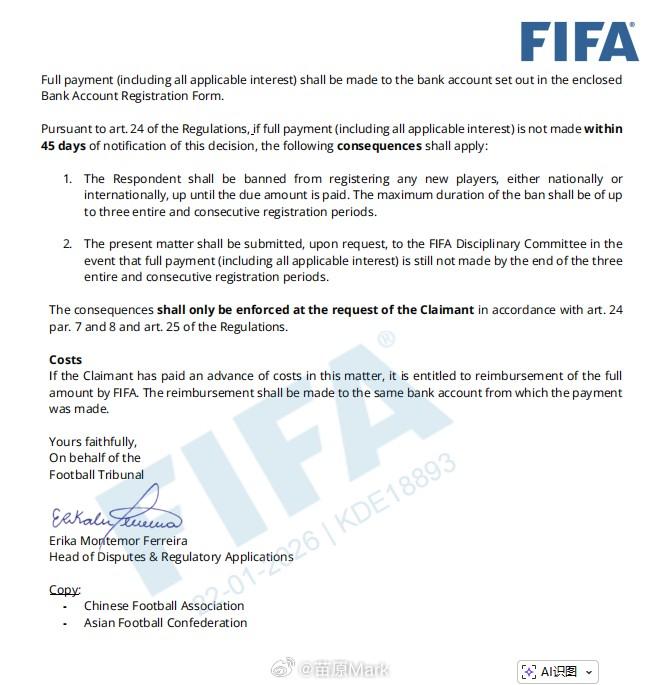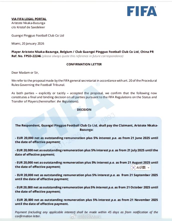 致函中写道,广西平果拖欠外援球员尼卡卡半年工资,拖欠工资为半年,每个月工资为20000欧元,需按照工资发放日后年利率5%支付违约金,在球员工资结清前,广西平果被禁止注册球员,处罚三个转会窗。