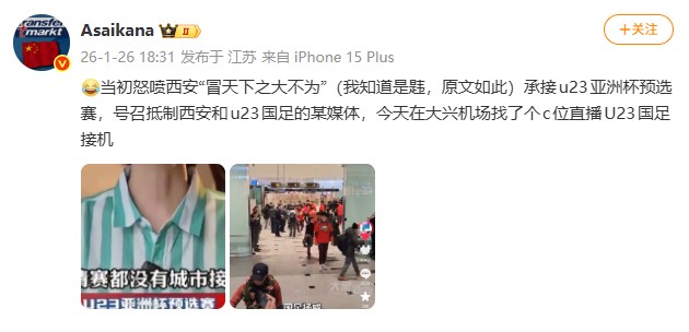 德转中国区管理员朱艺挖出了此前媒体喷西安“冒天下之大不为(韪,此处为朱艺有意为之)”承接U23亚洲杯预选赛、号召抵制西安和U23国足的言论,结果在今天国足将士返回时,该媒体还在北京大兴机场找了个“C位”直播接机U23国足将士。