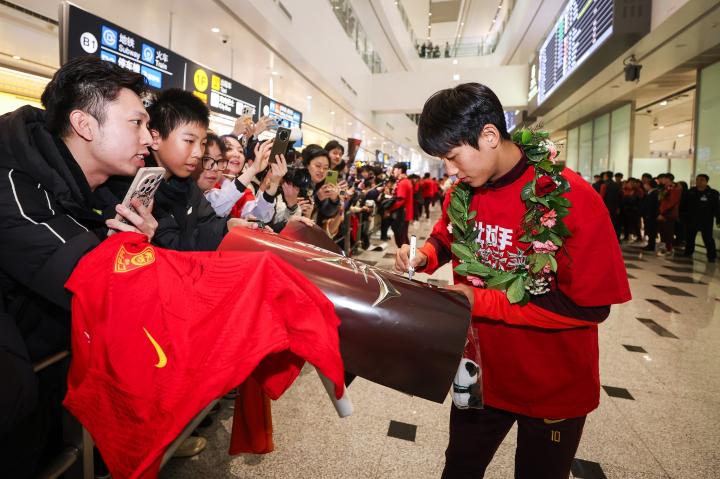 北京时间今天下午,U23国足已乘卡塔尔航空QR892次航班返回国内并降落在北京大兴国际机场,众多球迷来到现场接机。