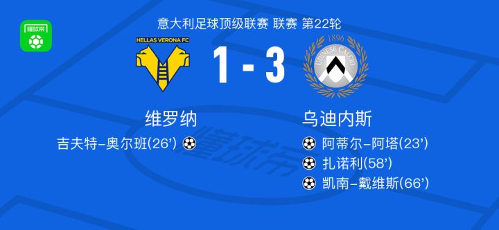 乌迪内斯3-1维罗纳,凯南-戴维斯建功,扎诺利破门