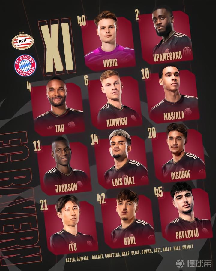 拜仁首发:40-乌尔比希、21-伊藤洋辉、2-于帕梅卡诺、4-约纳坦-塔、6-基米希、20-比朔夫、42-卡尔、45-帕夫洛维奇、10-穆西亚拉、14-路易斯-迪亚斯、11-雅克松