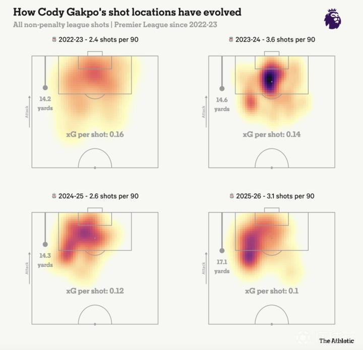 数据同样印证了肉眼所见。加克波下滑的一个关键原因是射门选择。下面的射门分布图显示,他更多选择在禁区左侧边缘、距离较远的位置进行冒险射门,而不是进入更具威胁的中路区域。