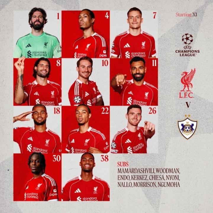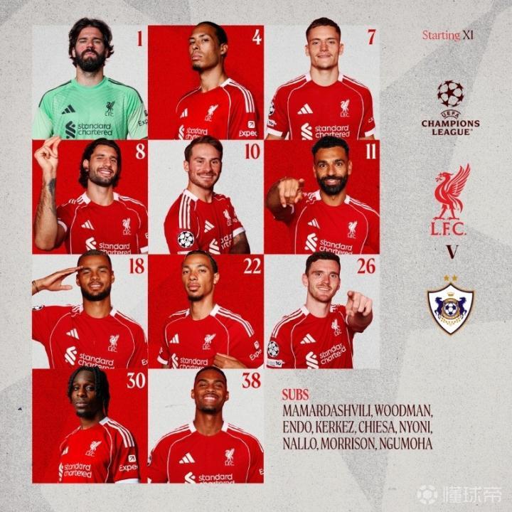 利物浦首发:1-阿利松、30-弗林蓬、26-罗伯逊、4-范戴克、38-赫拉芬贝赫、10-麦卡利斯特、8-索博斯洛伊、18-加克波、11-萨拉赫、7-维尔茨、22-埃基蒂克