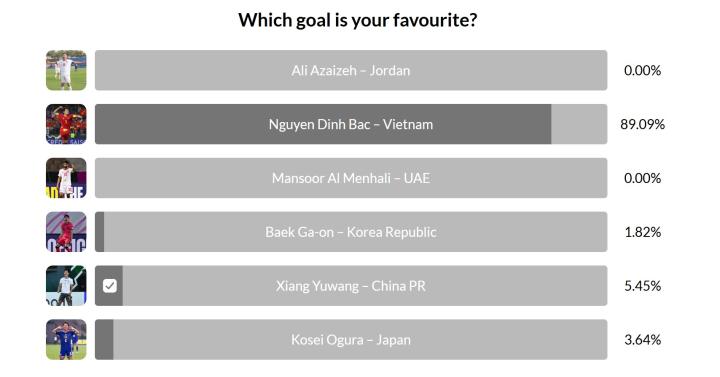 目前在该评选中,向余望获得的球迷得票率为5.45%位列第二,越南球迷心仪的阮庭北则以89.09%得票率高居第一。