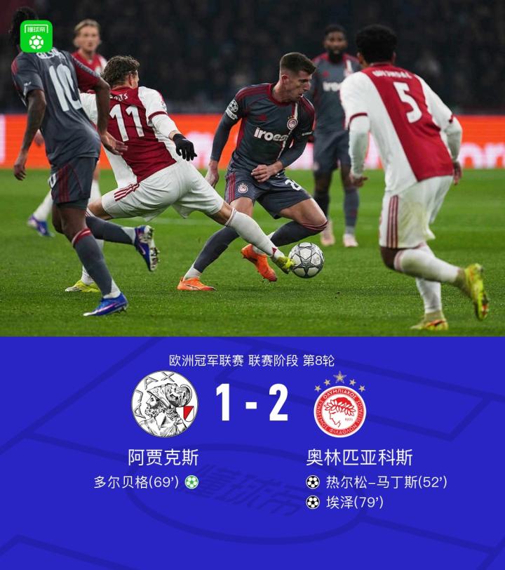 奥林匹亚科斯2-1阿贾克斯,埃泽破门,热尔松-马丁斯建功