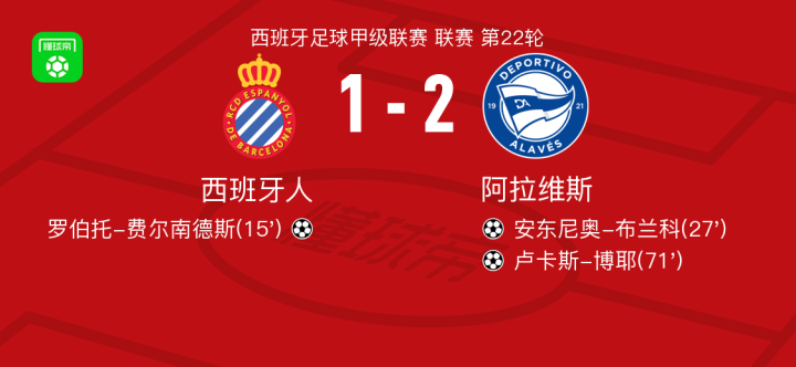 阿拉维斯2-1逆转西班牙人,卢卡斯-博耶、安东尼奥-布兰科破门