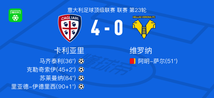 卡利亚里4-0大胜维罗纳,里亚德-伊德里西建功,苏莱曼纳破门